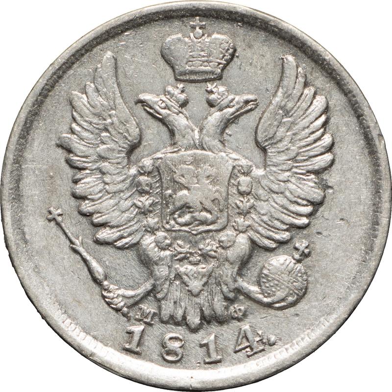 Descubra el valor actual de la moneda rusa de 20 kopeks de 1814 "Águila con alas levantadas" con marca de ceca СПБ МФ. Esta moneda de plata pertenece al tiempo de Alejandro I y fue acuñada en la ceca de San Petersburgo. ¿Cuál es el precio de una moneda como esta? El precio récord pertenece al lote 62 vendido en la subasta MS67 por RUB 65000. La subasta tuvo lugar el 8 de julio de 2020.