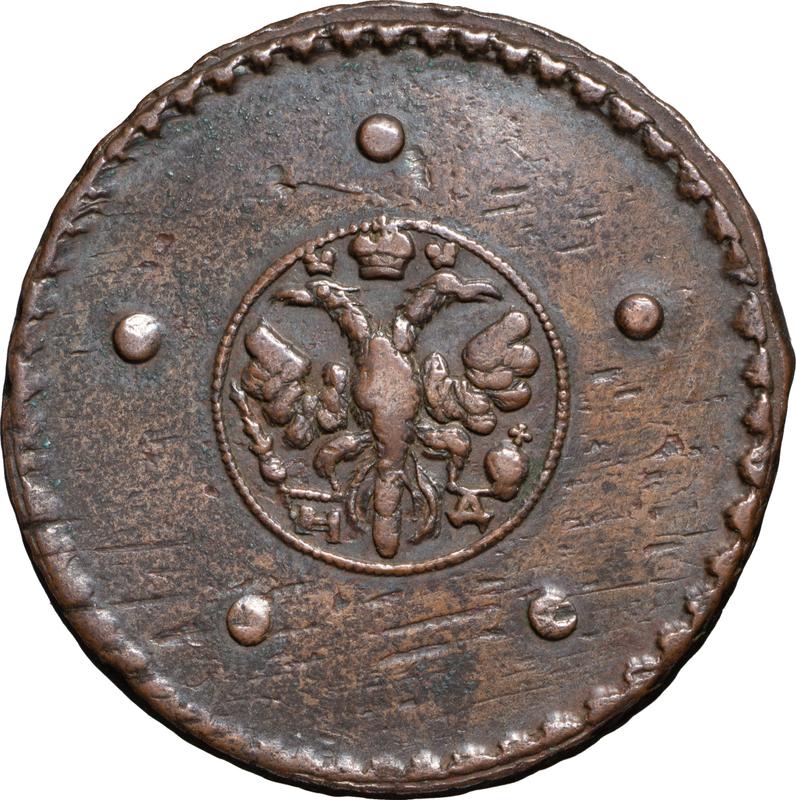 5 kopeks 1726 НД. La fecha de abajo hacia arriba (Rusia, Catalina I)