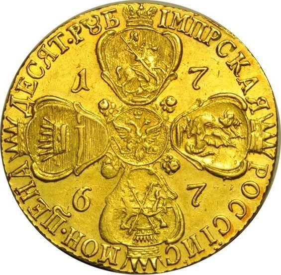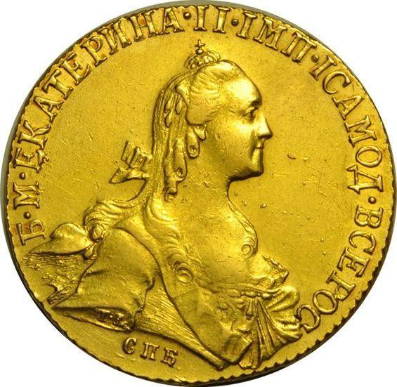 10 rublos 1767 СПБ "Tipo San Petersburgo, sin bufanda". Retrato más estrecho (Rusia, Catalina II)