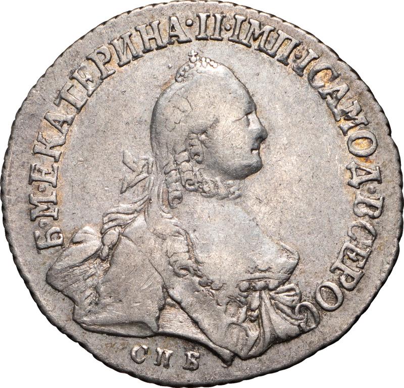 ¿Cuánto vale la moneda de platade de Catalina II de 20 kopeks del 1765. СПБ. "Con bufanda"?