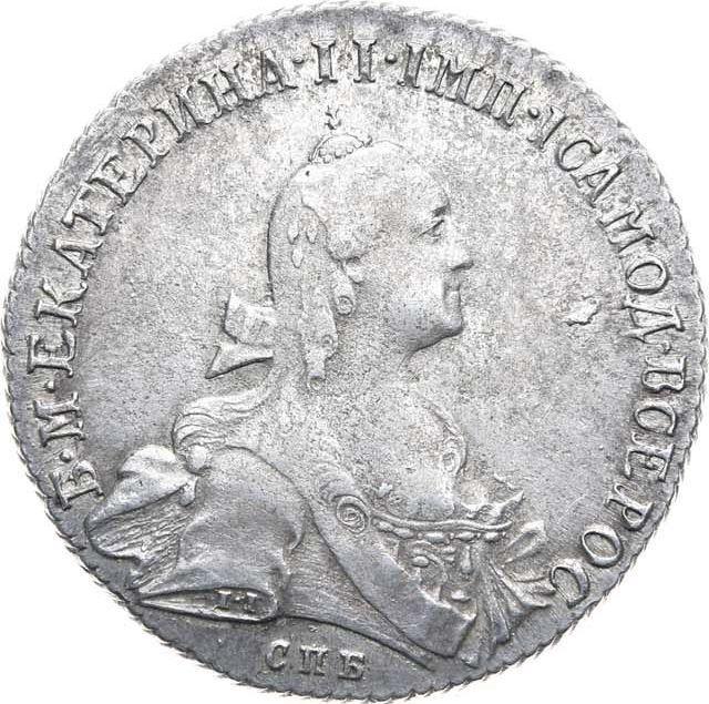 Descubra el valor actual de la moneda rusa de Poltina (1/2 rublo) de 1768 "Sin bufanda" con marca de ceca СПБ СА T.I.. Esta moneda de plata pertenece al tiempo de Catalina II y fue acuñada en la ceca de San Petersburgo. ¿Cuál es el precio de una moneda como esta? El precio récord pertenece al lote 319 vendido en la subasta Rare Coins por USD 8500. La subasta tuvo lugar el 26 de abril de 2014.