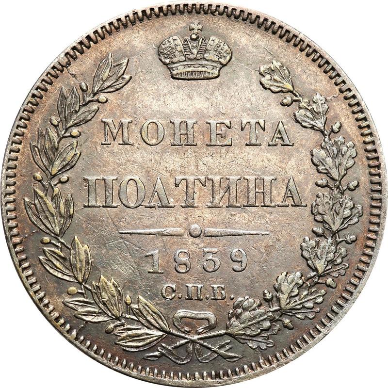 Descubra el valor actual de la moneda rusa de Poltina (1/2 rublo) de 1839 "Águila 1832-1842" con marca de ceca СПБ НГ. Corona ancha. Esta moneda de plata pertenece al tiempo de Nicolás I y fue acuñada en la ceca de San Petersburgo. ¿Cuál es el precio de una moneda como esta? El precio récord pertenece al lote 62 vendido en la subasta COINSTORE por EUR 680. La subasta tuvo lugar el 25 de enero de 2025.