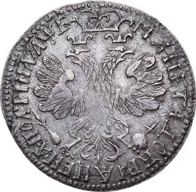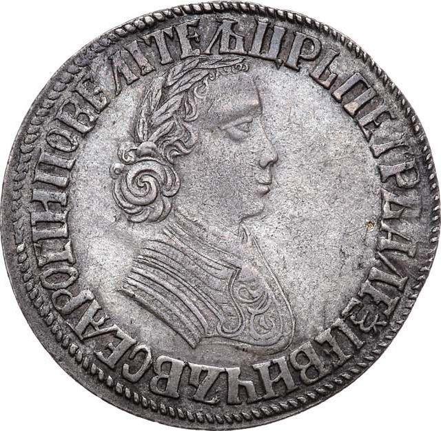 Poltina (1/2 rublo) ҂АΨE (1705) "Retrato del trabajo de F. Alexeev". En la base de la corona hay dos rizos (Rusia, Pedro I)