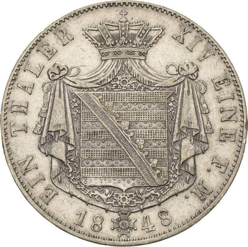 Descubra el valor actual de la moneda Sajonia-Coburgo-Gotha de Tálero de 1848 con marca de ceca F. Esta moneda de plata pertenece al tiempo de Ernesto II. ¿Cuál es el precio de una moneda como esta? El precio récord pertenece al lote 894 vendido en la subasta Heidelberger Münzhandlung Herbert Grün por EUR 2700. La subasta tuvo lugar el 11 de noviembre de 2020.
