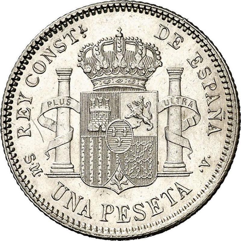 Descubra el valor actual de la moneda española de 1 peseta de 1905 con marca de ceca SMV. Esta moneda de plata pertenece al tiempo de Alfonso XIII y fue acuñada en la ceca de Madrid. ¿Cuál es el precio de una moneda como esta? El precio récord pertenece al lote 710 vendido en la subasta José A. Herrero, S.A. por EUR 1100. La subasta tuvo lugar el 8 de mayo de 2013.