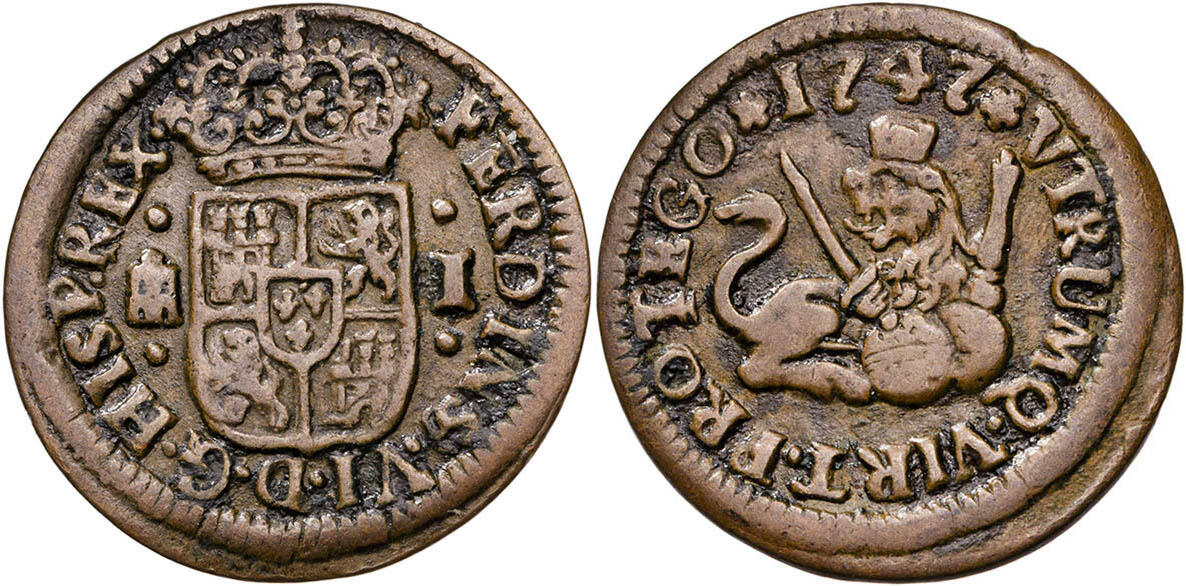 Descubra el valor actual de la moneda española de 1 maravedí de 1747 . Esta moneda de cobre pertenece al tiempo de Fernando VI y fue acuñada en la ceca de Segovia. ¿Cuál es el precio de una moneda como esta? El precio récord pertenece al lote 143 vendido en la subasta Aureo & Calicó, S.L. por EUR 320. La subasta tuvo lugar el 17 de diciembre de 2020.