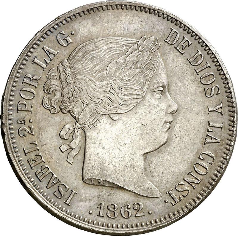 Descubra el valor actual de la moneda española de 20 reales de 1862 . Estrellas de seis puntas. Esta moneda de plata pertenece al tiempo de Isabel II y fue acuñada en la ceca de Madrid. ¿Cuál es el precio de una moneda como esta? El precio récord pertenece al lote 22746 vendido en la subasta Heritage Auctions por USD 1116. La subasta tuvo lugar el 6 de enero de 2013.