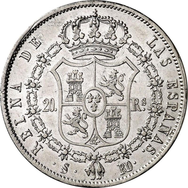 Descubra el valor actual de la moneda española de 20 reales de 1850 con marca de ceca S RD. Esta moneda de plata pertenece al tiempo de Isabel II y fue acuñada en la ceca de Sevilla. ¿Cuál es el precio de una moneda como esta? El precio récord pertenece al lote 1248 vendido en la subasta Aureo & Calicó, S.L. por EUR 3800. La subasta tuvo lugar el 29 de octubre de 2015.