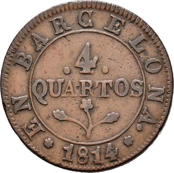 Descubra el valor actual de la moneda española de 4 cuartos de 1814 . Esta moneda de cobre pertenece al tiempo de José I Bonaparte y fue acuñada en la ceca de Barcelona. ¿Cuál es el precio de una moneda como esta? El precio récord pertenece al lote 2416 vendido en la subasta José A. Herrero, S.A. por EUR 135. La subasta tuvo lugar el 28 de mayo de 2014.