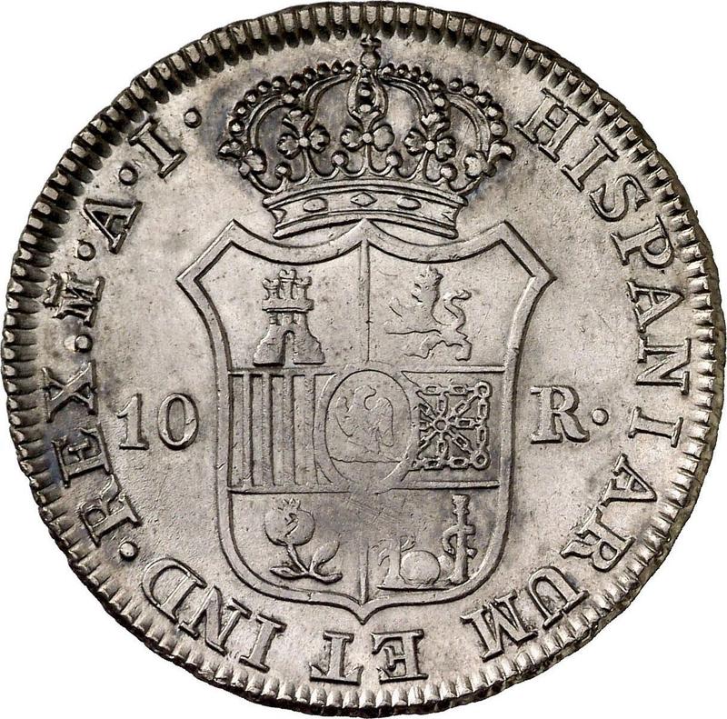 Descubra el valor actual de la moneda española de 10 reales de 1811 con marca de ceca M AI. Esta moneda de plata pertenece al tiempo de José I Bonaparte y fue acuñada en la ceca de Madrid. ¿Cuál es el precio de una moneda como esta? El precio récord pertenece al lote 456 vendido en la subasta MARTÍ HERVERA S.L por EUR 580. La subasta tuvo lugar el 10 de julio de 2014.