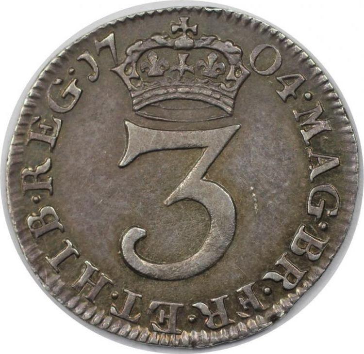 Descubra el valor actual de la moneda británica de 3 peniques de 1704 . Esta moneda de plata pertenece al tiempo de Ana. ¿Cuál es el precio de una moneda como esta? El precio récord pertenece al lote 2274 vendido en la subasta Ira & Larry Goldberg Coins & Collectibles, Inc. por USD 230. La subasta tuvo lugar el 28 de mayo de 2006.