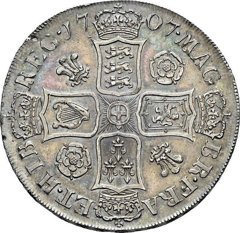 1 Corona 1707 "Primer tipo de retrato". Rosas y plumas en ángulos. Antes de la unión (Gran Bretaña, Ana)