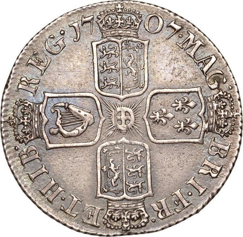Según los últimos datos, a fecha de 6 de diciembre de 2025, el valor medio de la moneda de plata de 1 chelín del 1707. E. "Segundo tipo de retrato" es de 250 USD para las monedas de acuñación regular y de 20000 USD para las monedas PROOF.