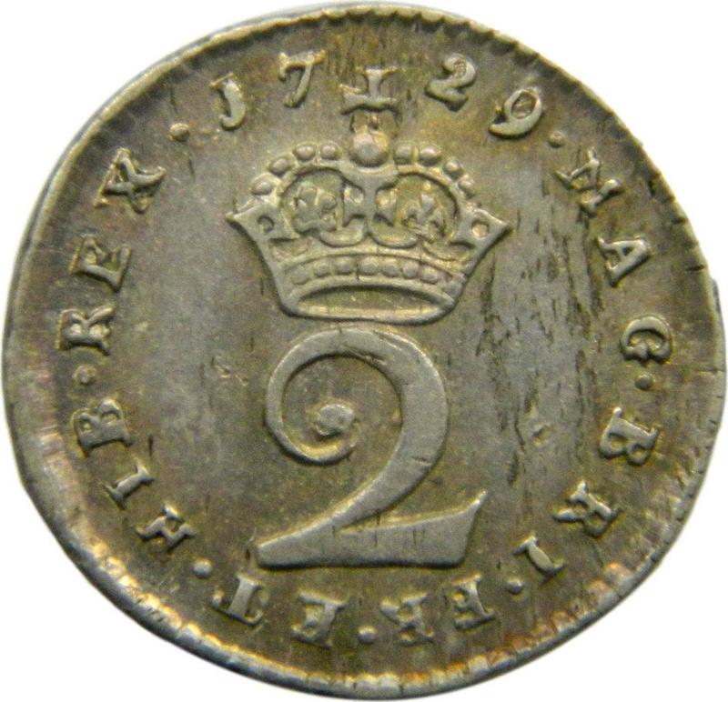 Descubra el valor actual de la moneda británica de 2 peniques de 1729 . Esta moneda de plata pertenece al tiempo de Jorge II. ¿Cuál es el precio de una moneda como esta? El precio récord pertenece al lote 218 vendido en la subasta Spink por USD 300. La subasta tuvo lugar el 24 de septiembre de 2015.