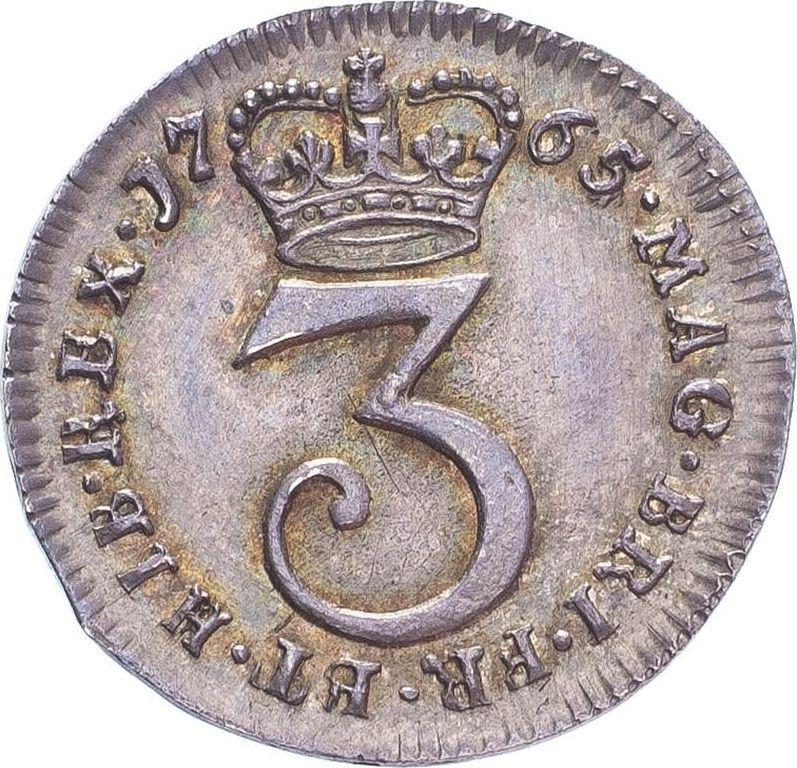 Descubra el valor actual de la moneda británica de 3 peniques de 1765 . Esta moneda de plata pertenece al tiempo de Jorge III. ¿Cuál es el precio de una moneda como esta? El precio récord pertenece al lote 2043 vendido en la subasta Baldwin's of St. James's por GBP 1500. La subasta tuvo lugar el 9 de diciembre de 2020.