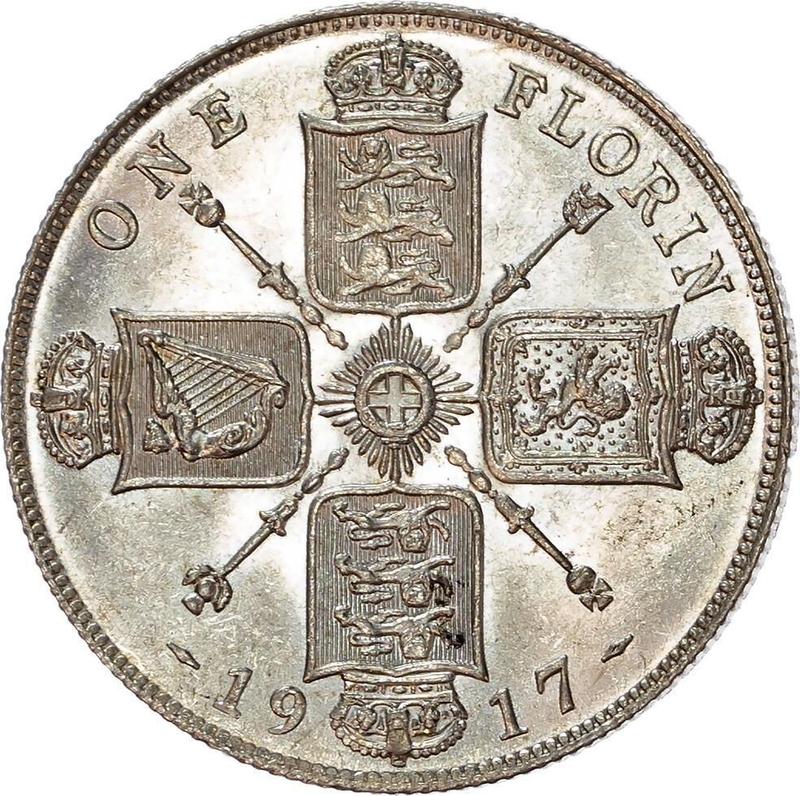 Descubra el valor actual de la moneda británica de Florín (2 chelines) de 1917 . Esta moneda de plata pertenece al tiempo de Jorge V. ¿Cuál es el precio de una moneda como esta? El precio récord pertenece al lote 290 vendido en la subasta Dix Noonan Webb por GBP 200. La subasta tuvo lugar el 4 de diciembre de 2019.