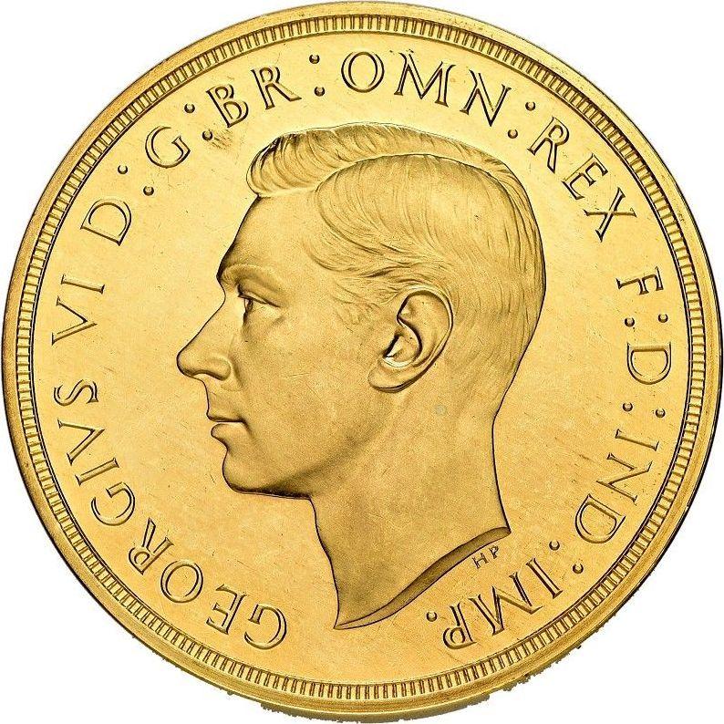 Descubra el valor actual de la moneda británica de 5 libras de 1937 con marca de ceca HP. Esta moneda de oro pertenece al tiempo de Jorge VI. ¿Cuál es el precio de una moneda como esta? El precio récord pertenece al lote 844 vendido en la subasta Auction World por JPY 12000000. La subasta tuvo lugar el 31 de enero de 2016.