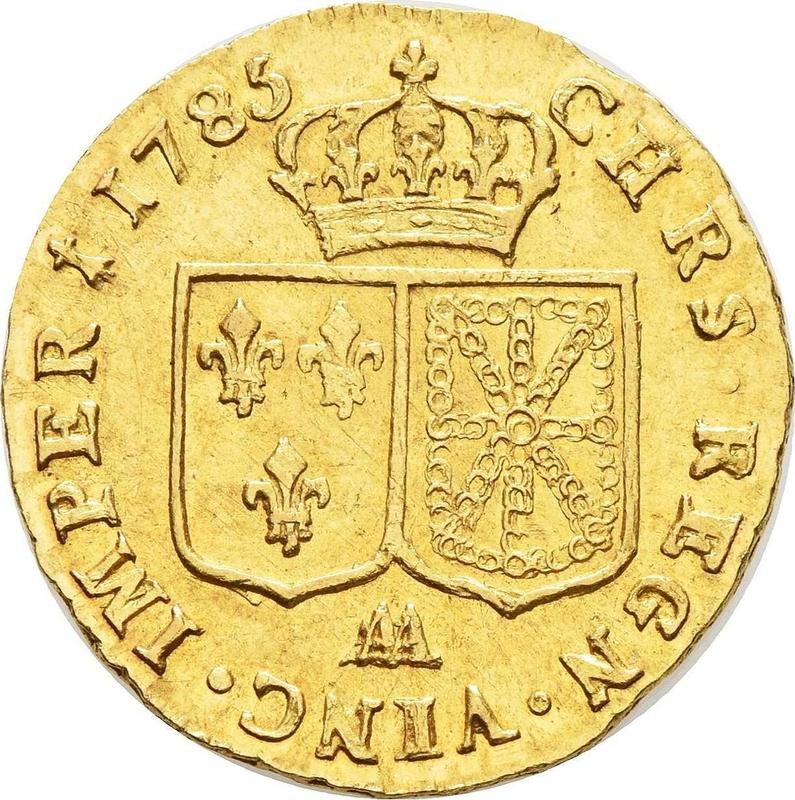 Sprawdź wartość monety francuskiej Louis d'or 1785 ze znakiem AA. Metz. Jest to złota moneta z okresu Ludwika XVI. Chcesz wiedzieć, ile jest warta moneta? Rekordowa cena należy do pozycji 614 z aukcji iNumis której łączna cena osiągnęła 1880 EUR. Licytacja odbyła się 21 października 2011.