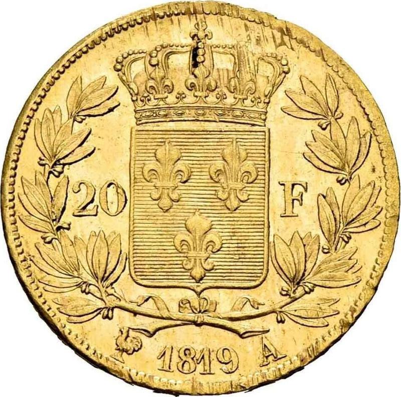 Sprawdź wartość monety francuskiej 20 franków 1819 ze znakiem A. Jest to złota moneta z okresu Ludwika XVIII. Chcesz wiedzieć, ile jest warta moneta? Rekordowa cena należy do pozycji 2107 z aukcji Bonhams Knightsbridge której łączna cena osiągnęła 29 250 USD. Licytacja odbyła się 8 grudnia 2010.