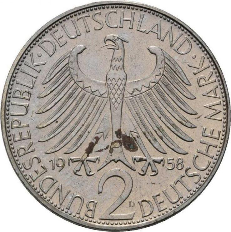 Według najnowszych danych na dzień 5 grudnia 2025, średnia cena monety 2 marki 1958 RFN ze znakiem D "Max Planck" wynosi 10 USD dla emisji obiegowej oraz 95 USD dla monet wybitych sztemplem lustrzanym. Moneta została wykonana z nieszlachetnego metalu, dlatego w słabym stanie zachowania może mieć bardzo niską wartość i płynność.