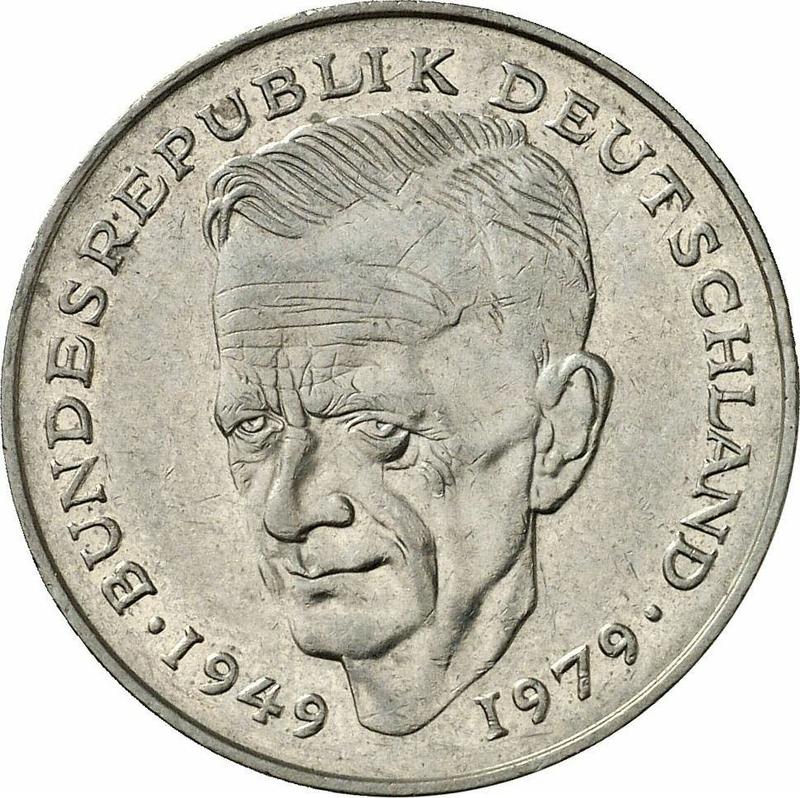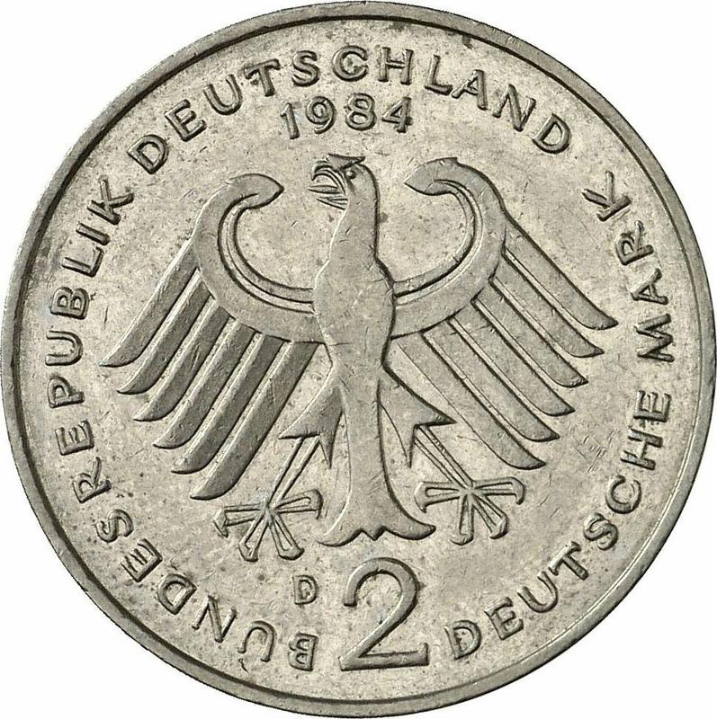 Sprawdź wartość monety niemieckiej 2 marki 1984 "Kurt Schumacher" ze znakiem D. Jest to miedziano-niklowa moneta z okresu RFN wybita w mennicy Monachium. Chcesz wiedzieć, ile jest warta moneta? Rekordowa cena należy do pozycji 4544 z aukcji Münzzentrum Rheinland, Heinz-W. Müller której łączna cena osiągnęła 36 EUR. Licytacja odbyła się 16 września 2020.