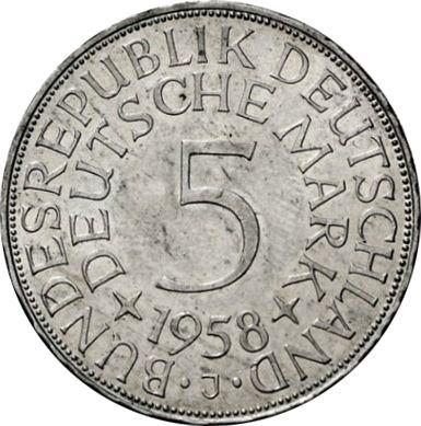 Według najnowszych danych na dzień 5 grudnia 2025, średnia cena srebrnej monety 5 marek 1958 RFN ze znakiem J wynosi 1200 USD dla emisji obiegowej oraz 260 USD dla monet wybitych sztemplem lustrzanym.