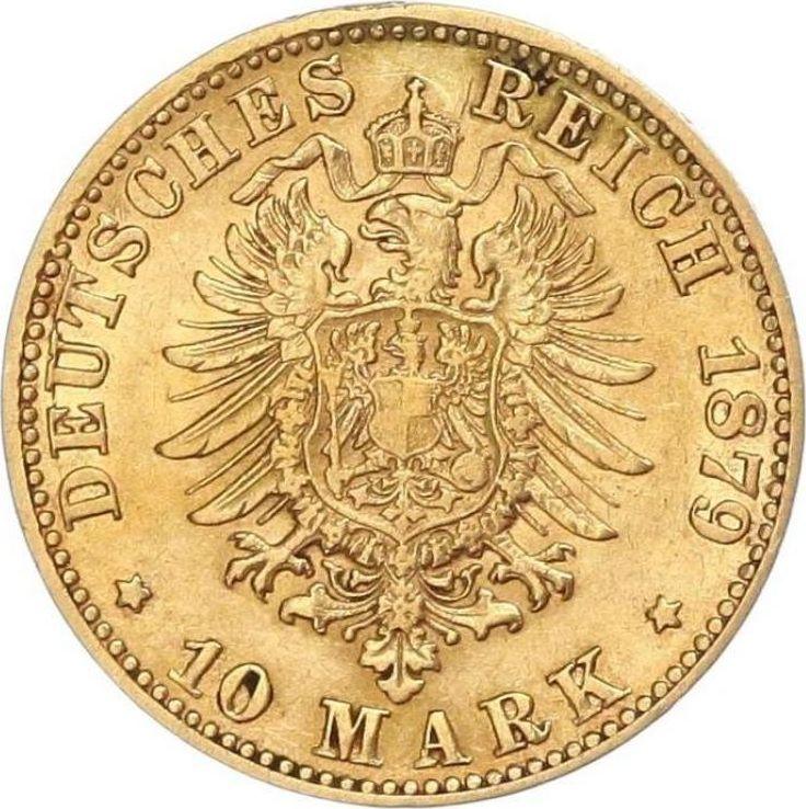 Sprawdź wartość monety niemieckiej 10 marek 1879 "Badenia" ze znakiem G. Jest to złota moneta z okresu Cesarstwa Niemieckiego wybita w mennicy Stuttgart. Chcesz wiedzieć, ile jest warta moneta? Rekordowa cena należy do pozycji 607 z aukcji Münzenhandlung Harald Möller GmbH której łączna cena osiągnęła 1300 EUR. Licytacja odbyła się 1 czerwca 2023.