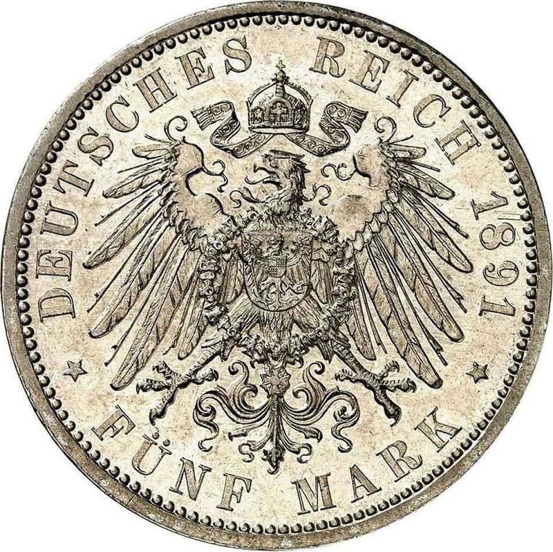 Według najnowszych danych na dzień 5 grudnia 2025, średnia cena srebrnej monety 5 marek 1891 Cesarstwa Niemieckiego ze znakiem A "Hesja" wynosi 1100 USD dla emisji obiegowej oraz 16000 USD dla monet wybitych sztemplem lustrzanym.