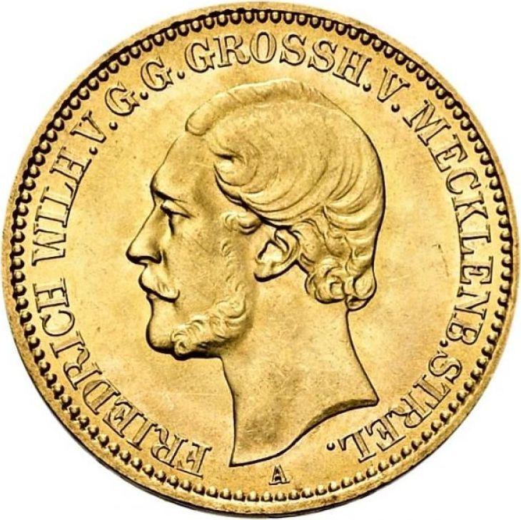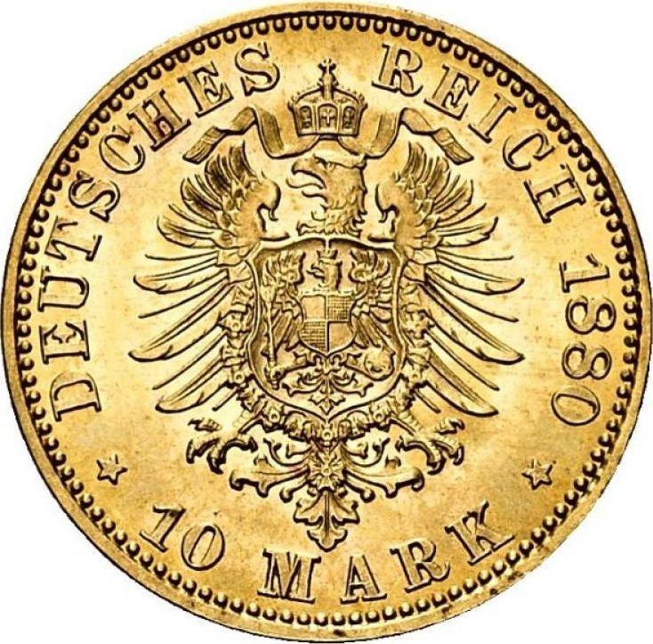Sprawdź wartość monety niemieckiej 10 marek 1880 "Meklemburgii-Strelitz" ze znakiem A. Jest to złota moneta z okresu Cesarstwa Niemieckiego wybita w mennicy Berlin. Chcesz wiedzieć, ile jest warta moneta? Rekordowa cena należy do pozycji 575 z aukcji Heidelberger Münzhandlung Herbert Grün której łączna cena osiągnęła 26 000 EUR. Licytacja odbyła się 25 maja 2011.