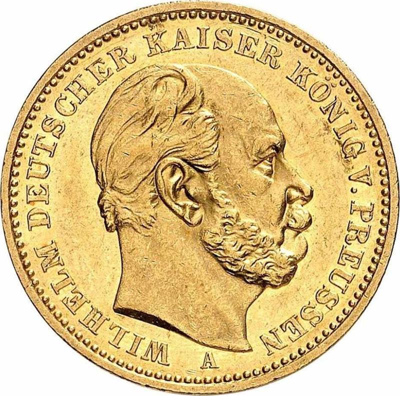 Według najnowszych danych na dzień 6 grudnia 2025, średnia cena złotej monety 20 marek 1885 Cesarstwa Niemieckiego ze znakiem A "Prusy" wynosi 450 USD. Moneta zawiera 7,1685 g czystego złota, dlatego nie zalecamy jej sprzedaży poniżej 967,55 USD, nawet jeśli znajduje się w słabym stanie zachowania i nie przedstawia wartości kolekcjonerskiej.