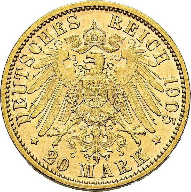 Według najnowszych danych na dzień 6 grudnia 2025, średnia cena złotej monety 20 marek 1905 Cesarstwa Niemieckiego ze znakiem J "Prusy" wynosi 540 USD dla emisji obiegowej oraz 990 USD dla monet wybitych sztemplem lustrzanym. Moneta zawiera 7,1685 g czystego złota, dlatego nie zalecamy jej sprzedaży poniżej 967,55 USD, nawet jeśli znajduje się w słabym stanie zachowania i nie przedstawia wartości kolekcjonerskiej.