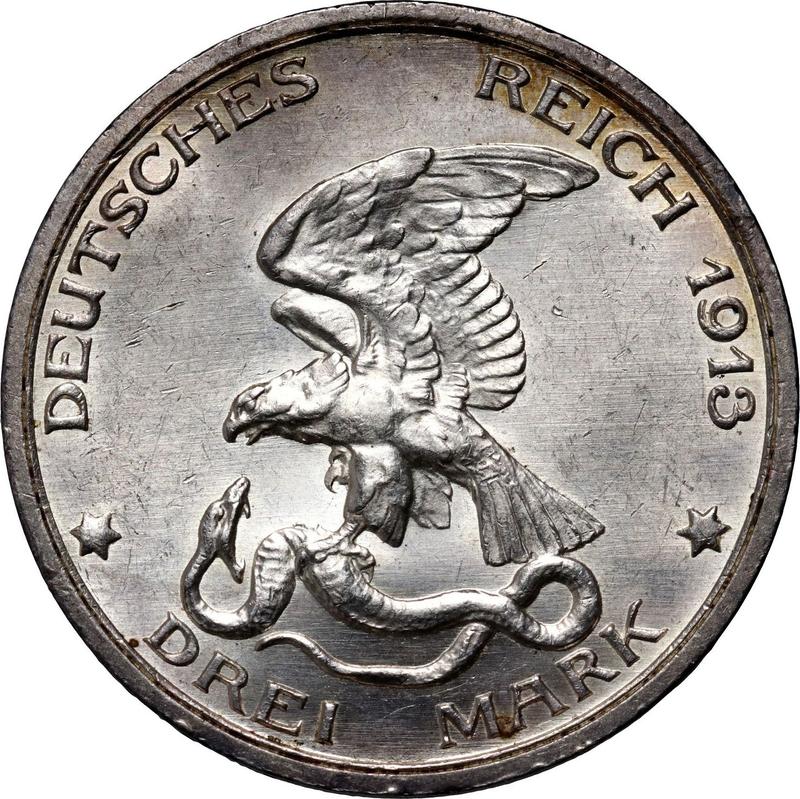 Według najnowszych danych na dzień 5 grudnia 2025, średnia cena srebrnej monety 3 marki 1913 Cesarstwa Niemieckiego ze znakiem A "Prusy" wynosi 55 USD dla emisji obiegowej oraz 300 USD dla monet wybitych sztemplem lustrzanym.