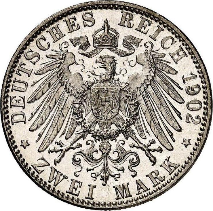 Według najnowszych danych na dzień 6 grudnia 2025, średnia cena srebrnej monety 2 marki 1902 Cesarstwa Niemieckiego ze znakiem D "Saksonia-Meiningen" wynosi 620 USD dla emisji obiegowej oraz 2000 USD dla monet wybitych sztemplem lustrzanym.