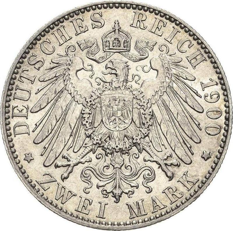 Według najnowszych danych na dzień 6 grudnia 2025, średnia cena srebrnej monety 2 marki 1900 Cesarstwa Niemieckiego ze znakiem E "Saksonia" wynosi 300 USD dla emisji obiegowej oraz 1300 USD dla monet wybitych sztemplem lustrzanym.
