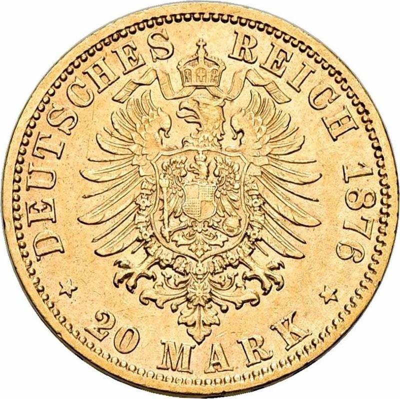 Sprawdź wartość monety niemieckiej 20 marek 1876 "Saksonia" ze znakiem E. Jest to złota moneta z okresu Cesarstwa Niemieckiego wybita w mennicy Drezno. Chcesz wiedzieć, ile jest warta moneta? Rekordowa cena należy do pozycji 30077 z aukcji Heritage Auctions której łączna cena osiągnęła 4700 USD. Licytacja odbyła się 13 sierpnia 2015.