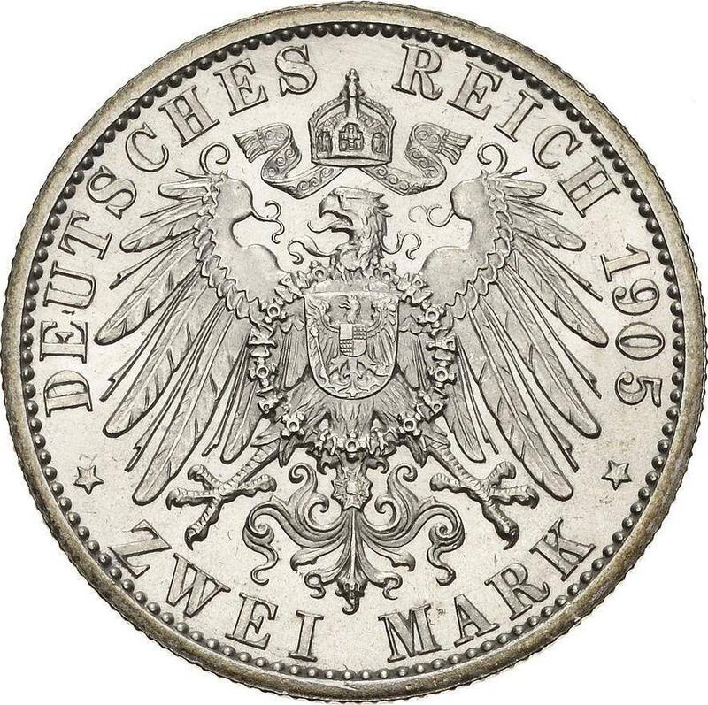 Według najnowszych danych na dzień 6 grudnia 2025, średnia cena srebrnej monety 2 marki 1905 Cesarstwa Niemieckiego "Schwarzburg-Sondershausen" wynosi 140 USD dla emisji obiegowej oraz 380 USD dla monet wybitych sztemplem lustrzanym.