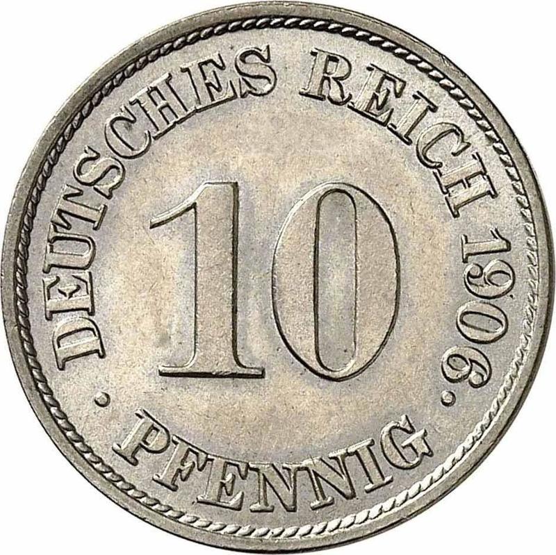 Według najnowszych danych na dzień 6 grudnia 2025, średnia cena monety 10 fenigów 1906 Cesarstwa Niemieckiego ze znakiem J wynosi 95 USD. Moneta została wykonana z nieszlachetnego metalu, dlatego w słabym stanie zachowania może mieć bardzo niską wartość i płynność.