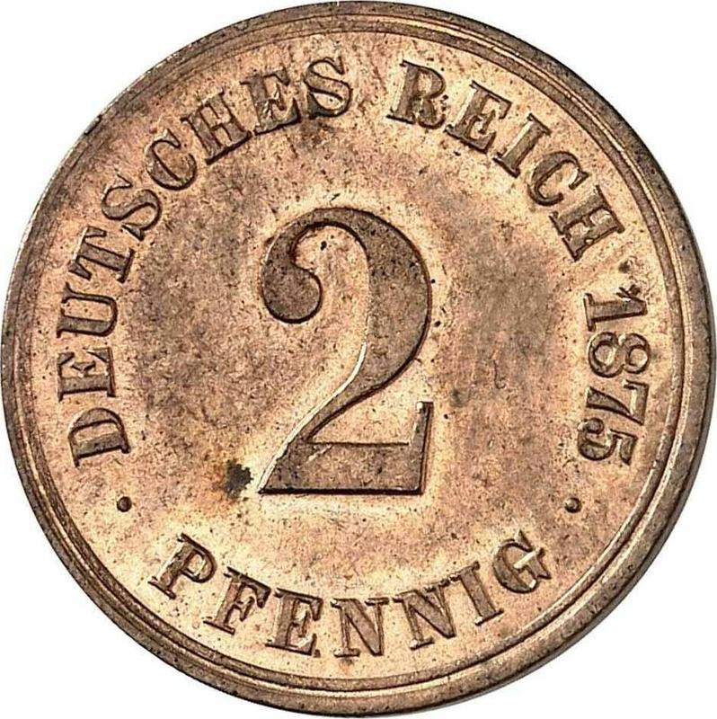 Według najnowszych danych na dzień 6 grudnia 2025, średnia cena monety 2 fenigi 1875 Cesarstwa Niemieckiego ze znakiem J wynosi 40 USD. Moneta została wykonana z nieszlachetnego metalu, dlatego w słabym stanie zachowania może mieć bardzo niską wartość i płynność.