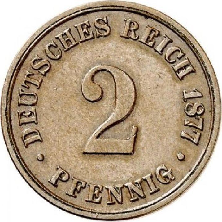 Według najnowszych danych na dzień 6 grudnia 2025, średnia cena monety 2 fenigi 1877 Cesarstwa Niemieckiego ze znakiem B wynosi 290 USD. Moneta została wykonana z nieszlachetnego metalu, dlatego w słabym stanie zachowania może mieć bardzo niską wartość i płynność.