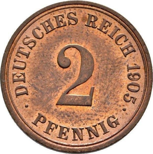 Według najnowszych danych na dzień 6 grudnia 2025, średnia cena monety 2 fenigi 1905 Cesarstwa Niemieckiego ze znakiem A wynosi 140 USD dla monet wybitych sztemplem lustrzanym. Moneta została wykonana z nieszlachetnego metalu, dlatego w słabym stanie zachowania może mieć bardzo niską wartość i płynność.