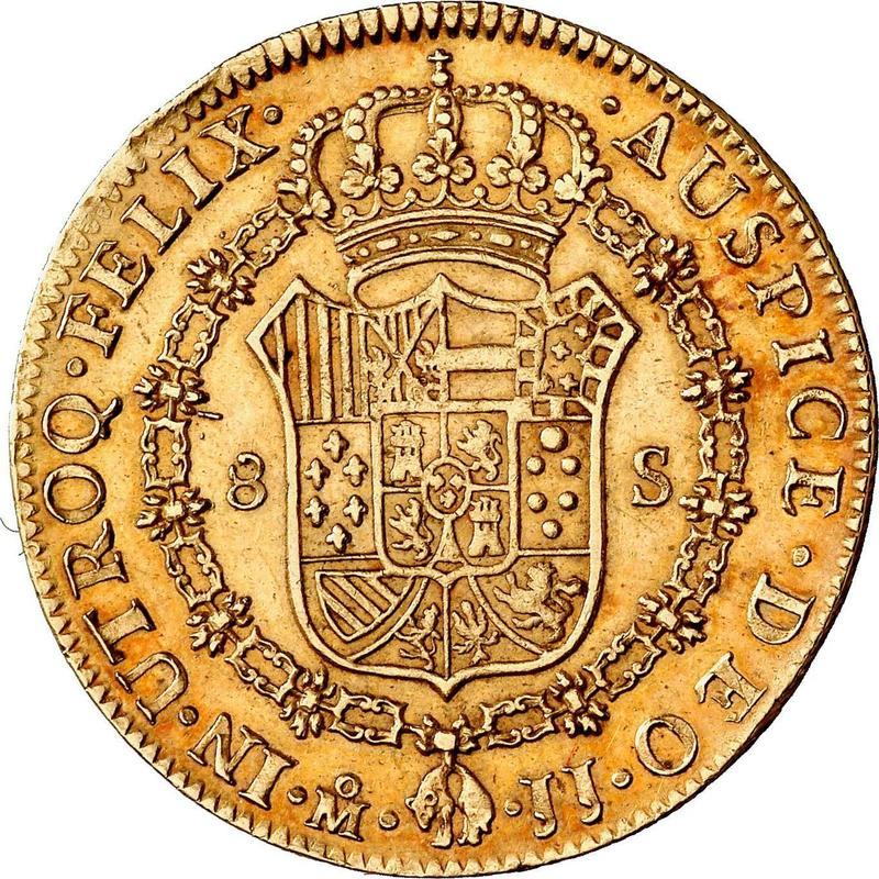 Sprawdź wartość monety meksykańskiej 8 escudo 1815 ze znakiem Mo JJ. Jest to złota moneta z okresu Ferdynanda VII. Chcesz wiedzieć, ile jest warta moneta? Rekordowa cena należy do pozycji 3235 z aukcji Stack's Bowers której łączna cena osiągnęła 4600 USD. Licytacja odbyła się 15 kwietnia 2005.