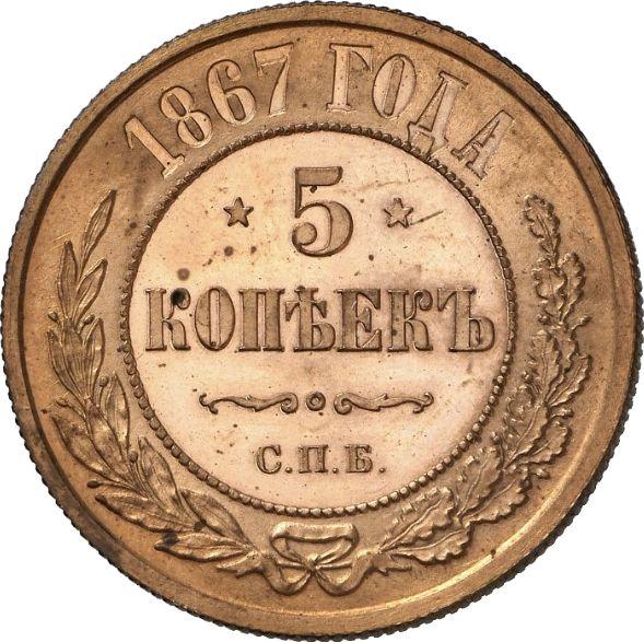 Według najnowszych danych na dzień 6 grudnia 2025, średnia cena monety 5 kopiejek 1867 Aleksandra II ze znakiem СПБ wynosi 1300 USD dla emisji obiegowej oraz 12000 USD dla monet wybitych sztemplem lustrzanym. Moneta została wykonana z nieszlachetnego metalu, dlatego w słabym stanie zachowania może mieć bardzo niską wartość i płynność.