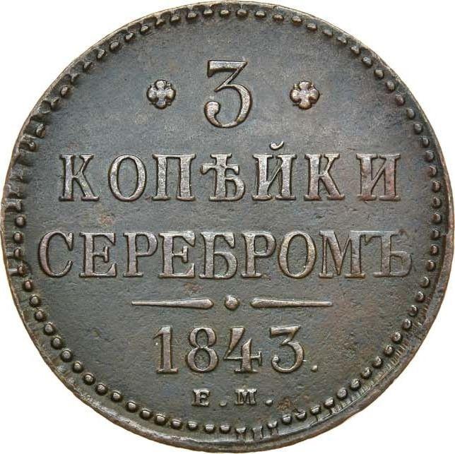 Według najnowszych danych na dzień 5 grudnia 2025, średnia cena monety 3 kopiejki 1843 Mikołaja I ze znakiem ЕМ wynosi 270 USD. Moneta została wykonana z nieszlachetnego metalu, dlatego w słabym stanie zachowania może mieć bardzo niską wartość i płynność.