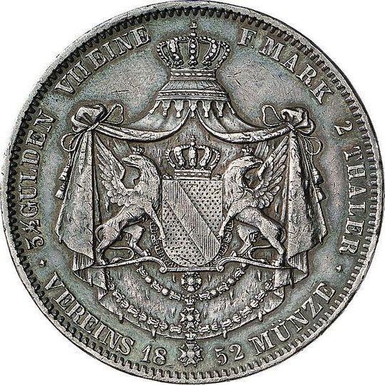 Узнайте актуальную стоимость баденской монеты 2 талера 1852 года. Это серебряная монета периода Фридриха I отчеканена на Карлсруэ монетном дворе. Рекорд цены принадлежит лоту 167 проданному на аукционе Heidelberger Münzhandlung Herbert Grün за 53500 EUR. Торги состоялись 15 ноября 2011.
