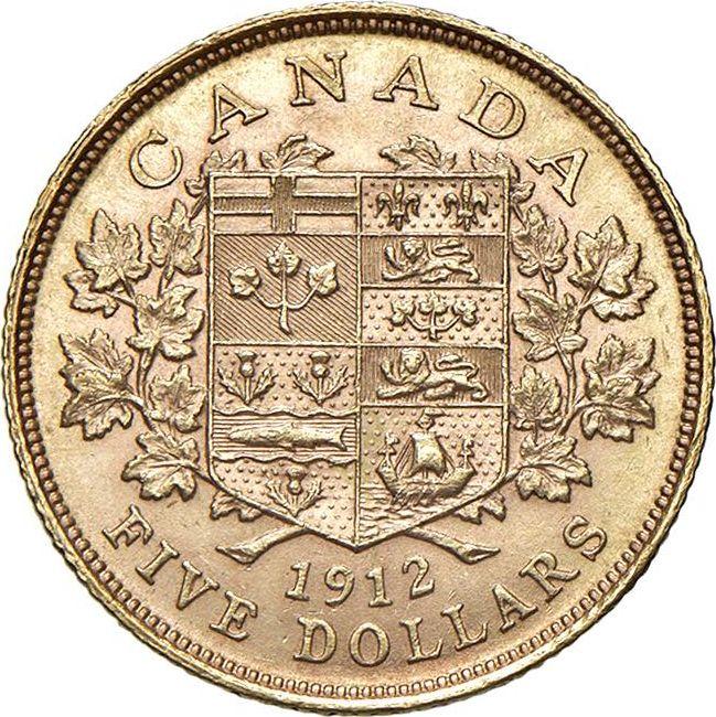 Узнайте актуальную стоимость канадской монеты 5 долларов 1912 года. Это золотая монета периода Георга V. Рекорд цены принадлежит лоту 29160 проданному на аукционе Heritage Auctions за 23500 USD. Торги состоялись 13 августа 2015.