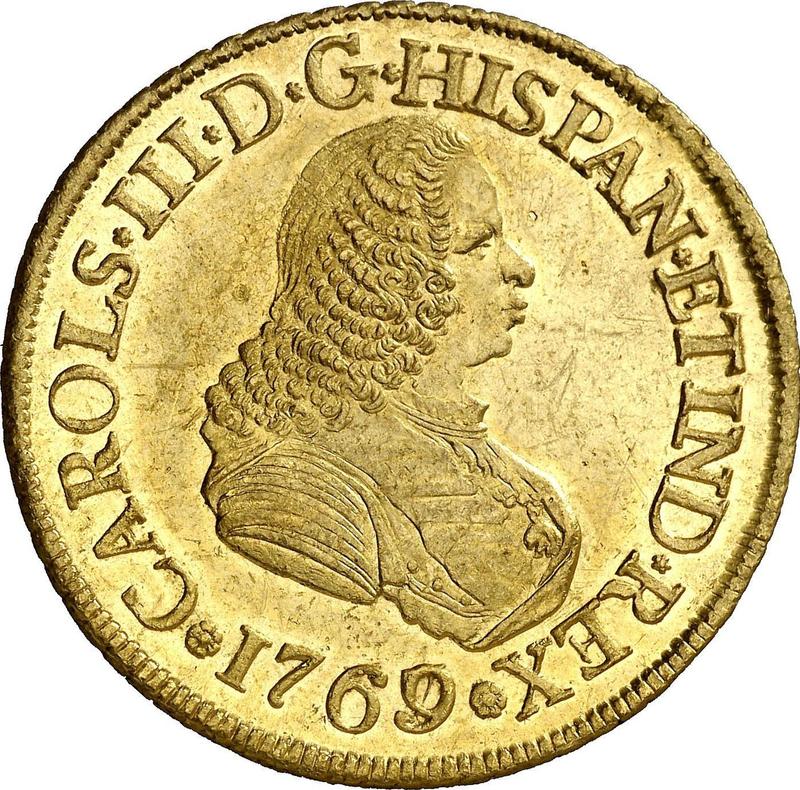 Сколько стоит золотая монета Карла III 8 эскудо 1769 года PN J?