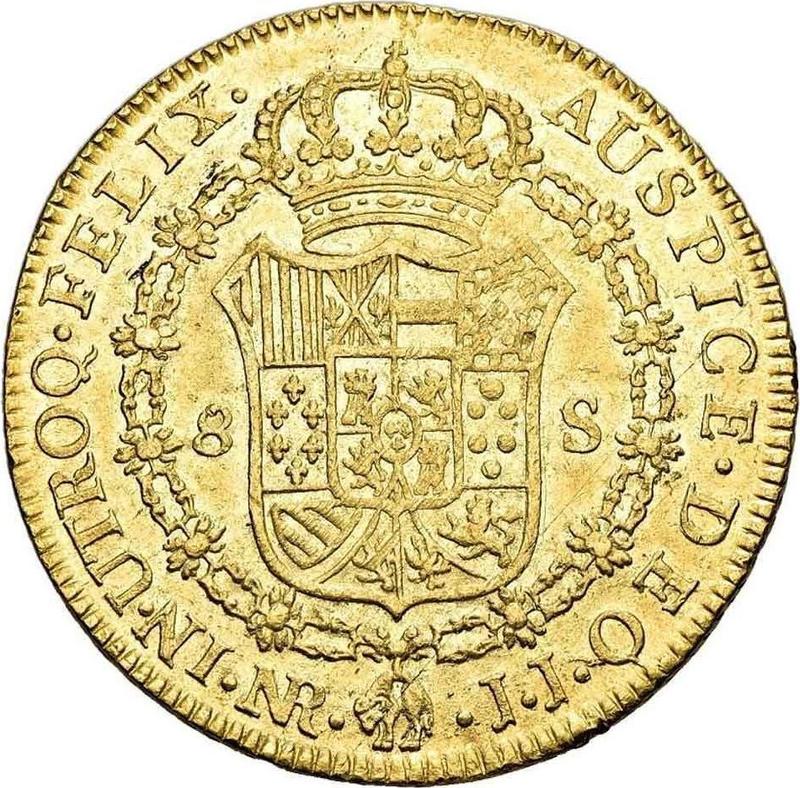 По последним данным на 6 декабря 2025 средняя стоимость золотой монеты 8 эскудо 1789 года с буквами NR JJ составляет 2800 USD. В монете содержится 23,625 гр чистого золота, поэтому ниже 3188,5 USD продавать монету не рекомендуем, даже если она в плохой сохранности и не представляет коллекционного интереса.
