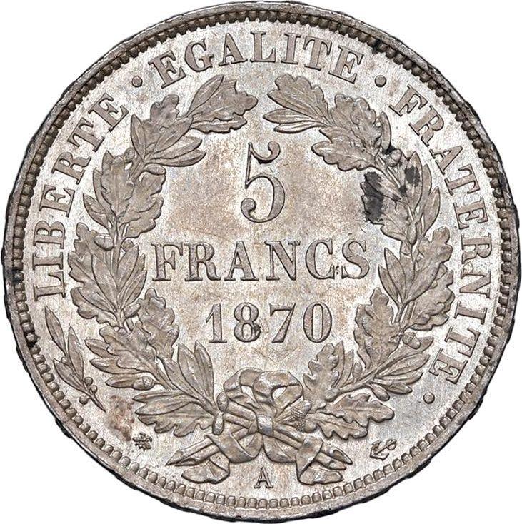 5 франков 1870 года A "С лозунгом" (Франция, Третья республика)