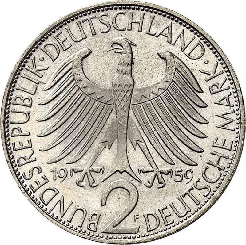 По последним данным на 5 декабря 2025 средняя стоимость медно-никелевой монеты 2 марки 1959 года "Планк" с буквами F составляет 75 USD для регулярного чекана и 3200 USD для монет отчеканенных по технологии PROOF. Монета выполнена из недрагоценного металла, поэтому в плохой сохранности может иметь карайне низкую стоимость и ликвидность.