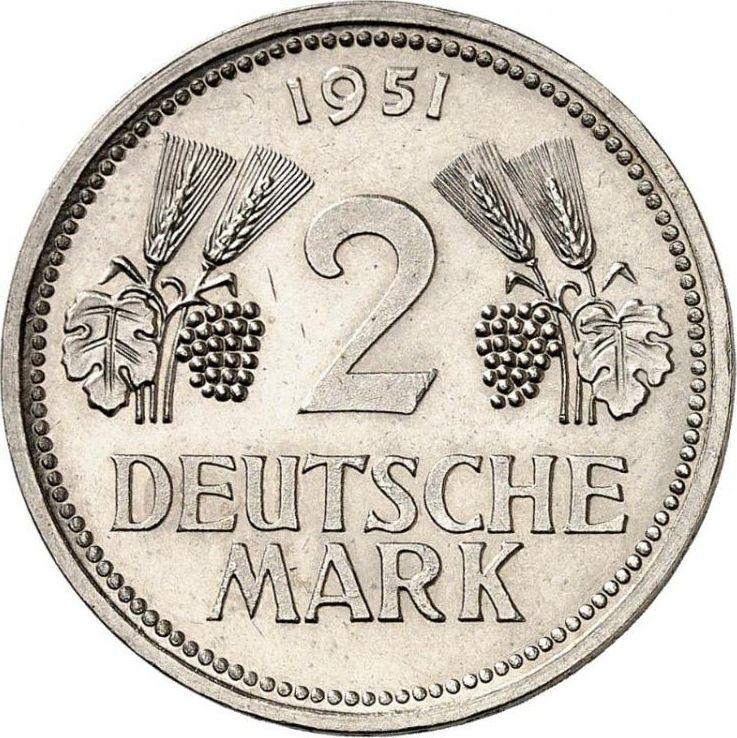 Узнайте актуальную стоимость немецкой монеты 2 марки 1951 года со знаком D. Большой диаметр. Пробные. Это медно-никелевая монета периода ФРГ. Рекорд цены принадлежит лоту 5563 проданному на аукционе Fritz Rudolf Künker GmbH & Co. KG за 2800 EUR. Торги состоялись 20 июня 2018.